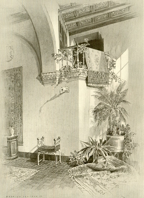 Inside, a spacious 18’ x 69’ foot center hall included a large staircase and welcoming fireplace. The interior design layered dark wainscoting with lighter walls and plaster frieze above. An impressive 10' tall stained glass window, The Twelve Immortals by Clayton and Bell of London, was installed at the top of the grand first floor landing. Oak and mahogany paneling, stair rails and wainscoting were hand-carved and imported from Europe. Walls were hung with tapestries, and the kitchen had an immense coal stove.
